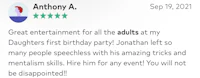 From intimate gatherings to virtual events and grand stages, Jonathan Schumacher brings magic to life with performances tailored to your needs.